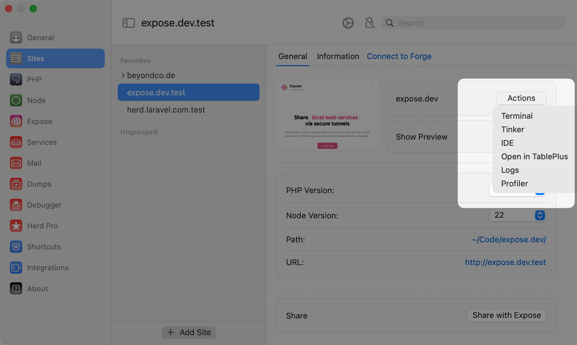 You can connect a Herd site with one or more sites on Laravel Forge. You can learn more about this feature in Forge Integration docs.Site Actions