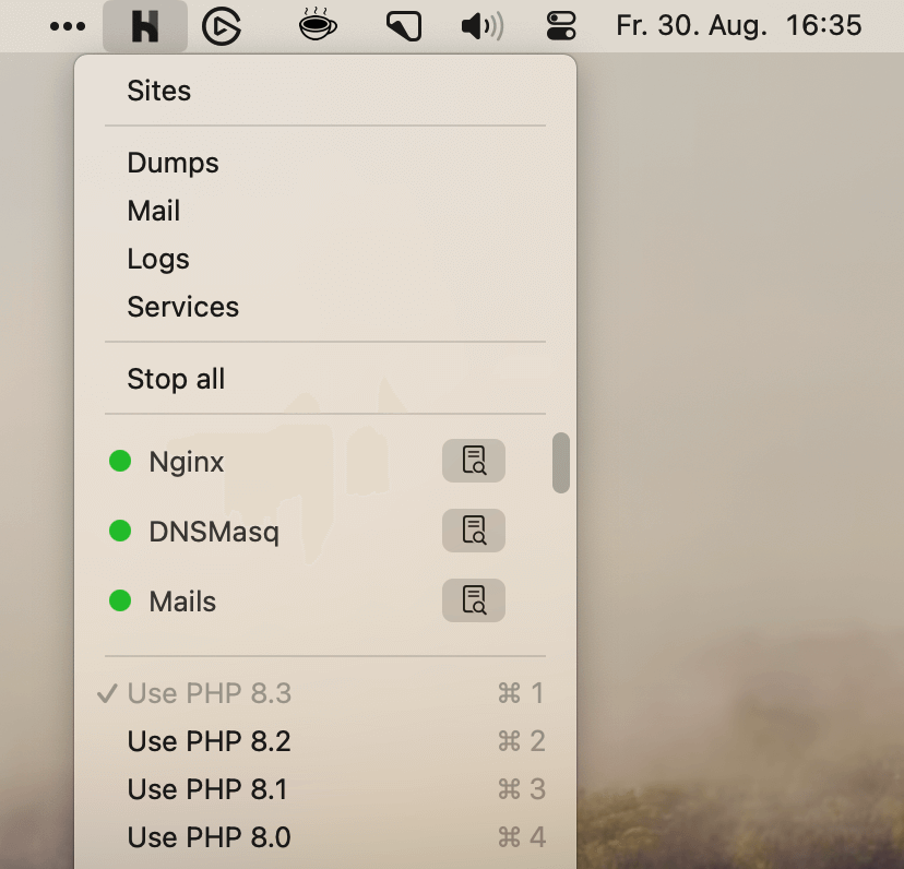 Herd ships with the latest stable PHP version by default. Currently, that’s PHP 8.3. However, you may install and use different PHP versions for your sites and configure Herd that every project uses the version that it needs.Using different PHP versions via the GUI