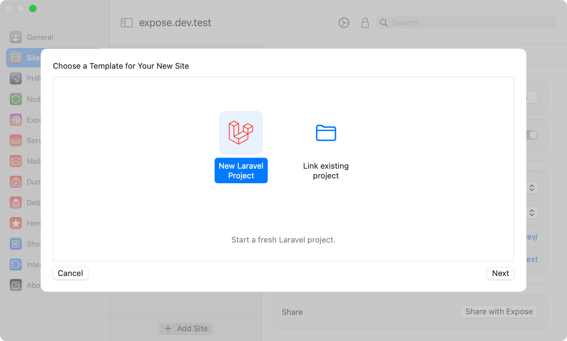 If you prefer creating and linking sites via a graphical user interface, you can use Herd’s site wizard to create new Laravel applications or link existing projects. You can start the site wizard by opening the Site Manager from the Herd menu bar icon and selecting the plus icon at the top left.