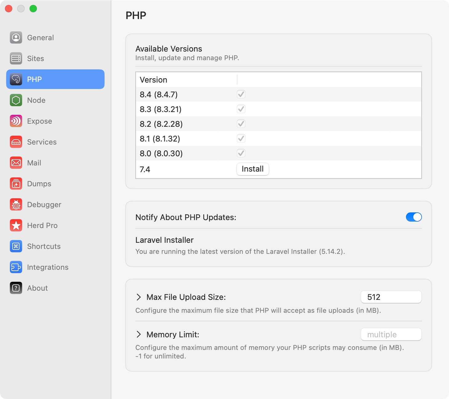 The most common configurations that usually require changes in your Nginx configuration are the maximum file upload size and the memory limit. You can change these settings via the Herd UI within the PHP settings section. You can either configure them for all PHP versions or set specific values per PHP version.