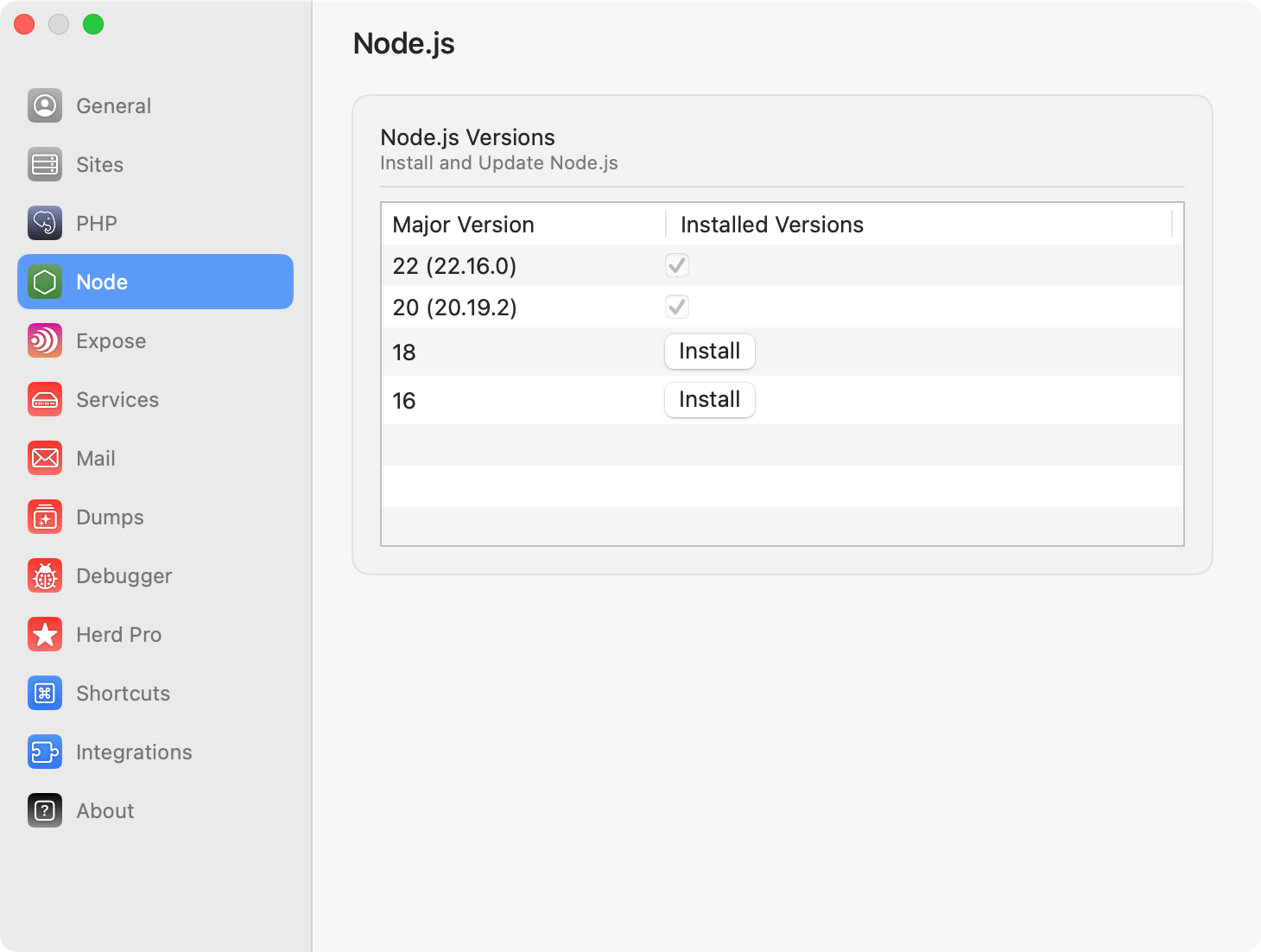 Herd ships with nvm, the Node version manager which allows the management of multiple Node.js versions on your machine. By default, Herd automatically installs the latest available version of Node.js for you. Herd requires a specific nvm version and can’t use existing nvm installations. If you are migrating from a previous nvm setup, please consult the Troubleshooting section if it doesn’t work as expected.Via the GUI